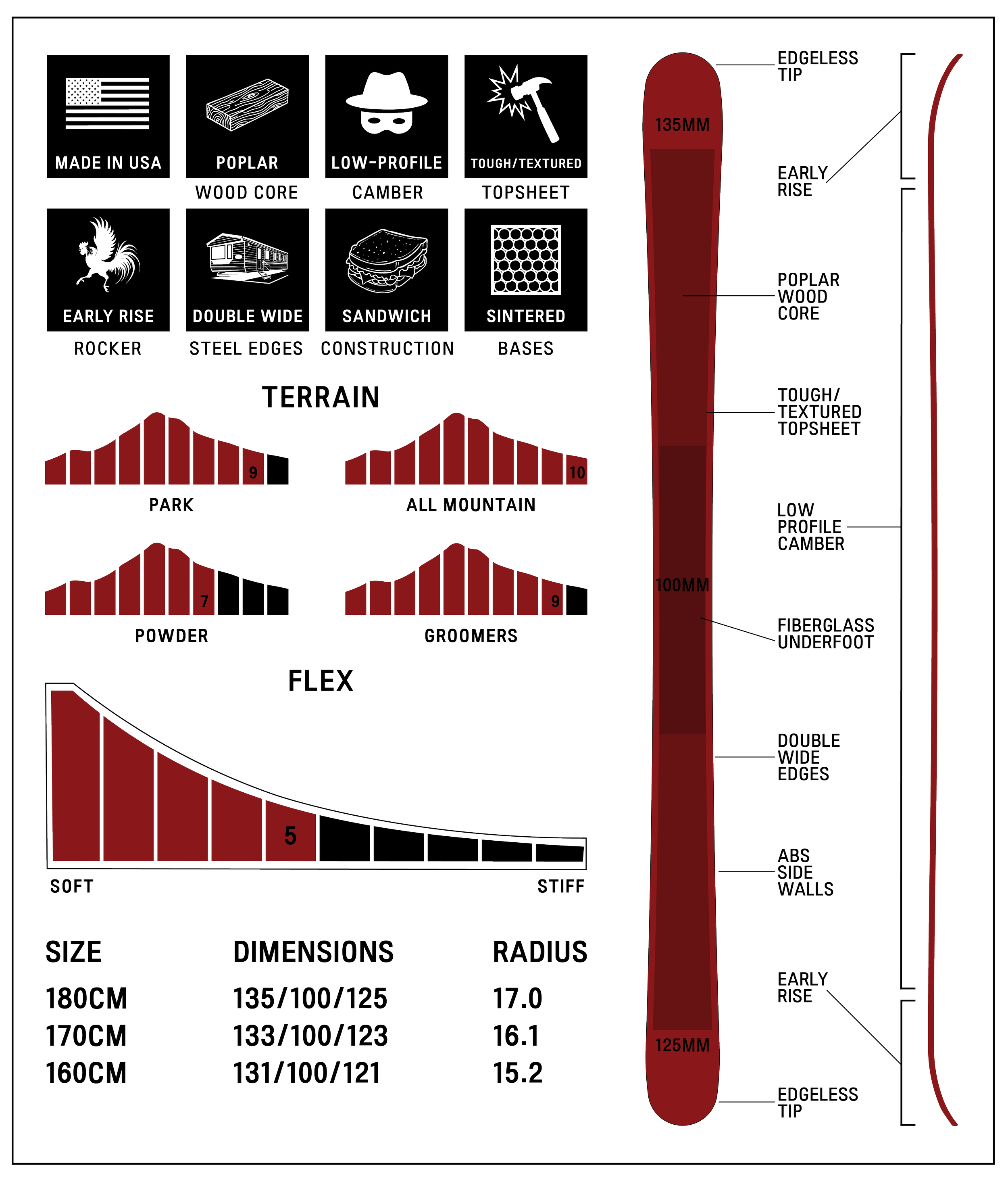 Lightweight construction, with a full poplar wood core that adds stability without losing energy. Low-profile camber underfoot, paired with early rise in the tip and tail, keeps the ski predictable on takeoffs and landings while still allowing for presses and butters when applicable.