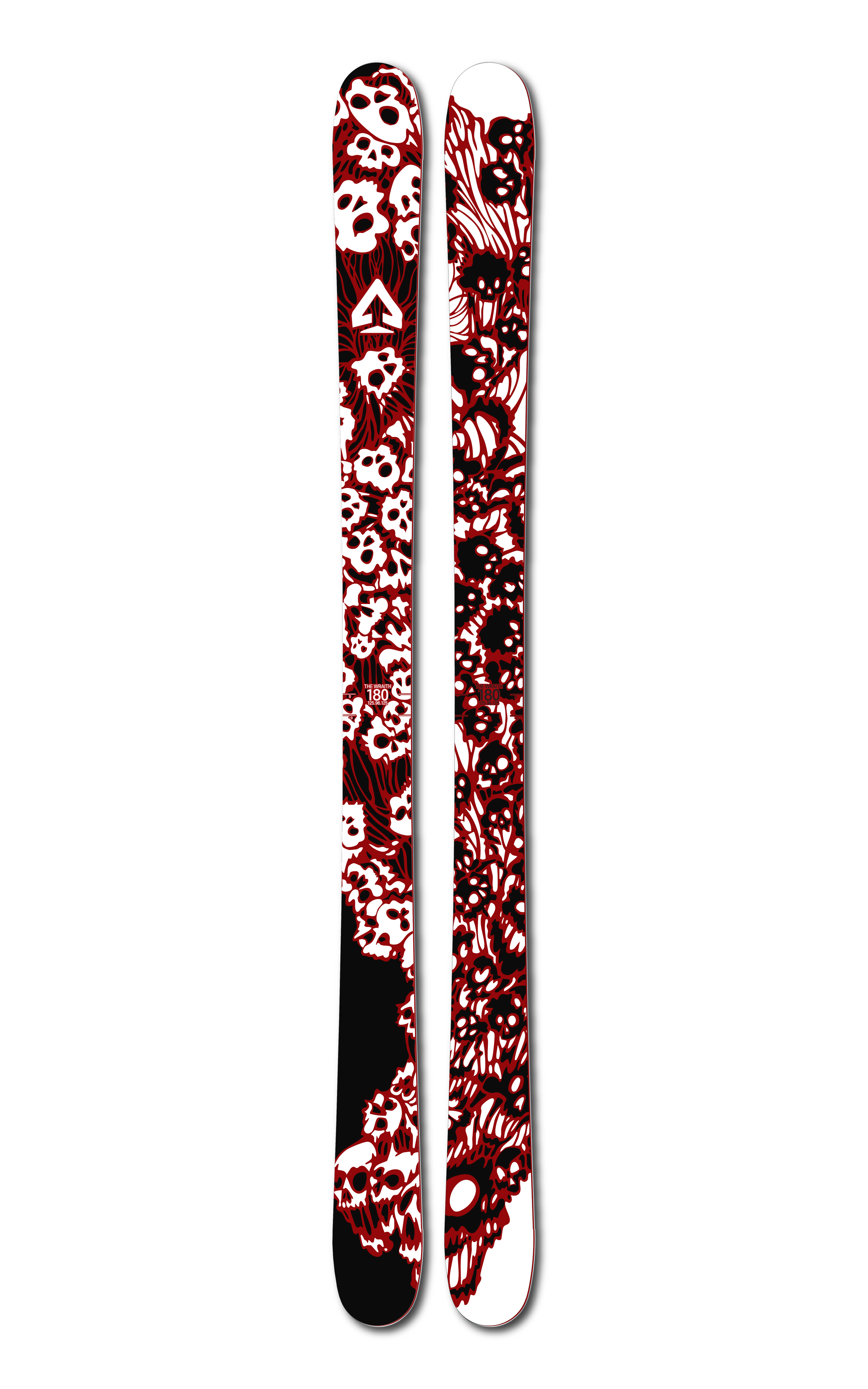 “Lightweight and heavy duty, The Royale combines a poplar wood core, “low-profile” camber + hybrid early rise shape, thick 2.5mm steel edges, reinforced hardwood underfoot, and a tough textured top-sheet making for a dependable all-around park ski, built to stand up to every day jib usage.”
